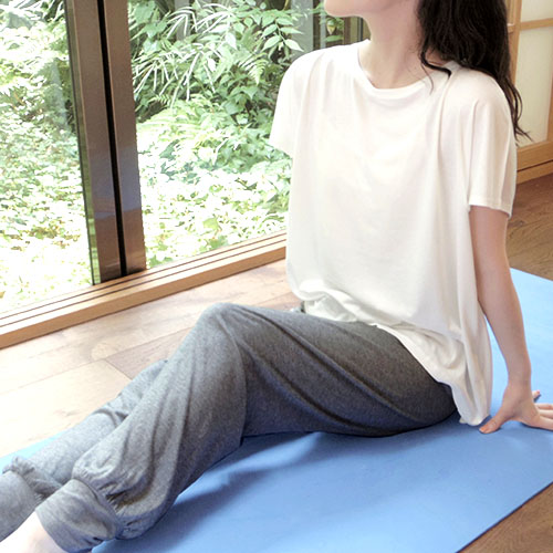 身体の動きに寄り添うしなやかな素材だから、リラックスタイムも、ヨガやジムの時も、着心地抜群。吸汗性にすぐれ、汗をかいてもサラッとした肌ざわり。竹繊維の天然の抗菌消臭作用で汗のニオイも気になりません。一日じゅう着ていたい、快適なリラックスパンツです。